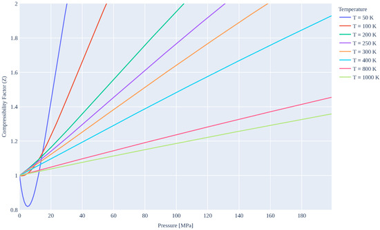 Figure 4 illustrates the deviation of hydrogen from ideal gas behavior at various temperatures, with compression from 0 to , represented by real gas factors [62]. The discrepancy between ideal and real gas behavior increases predominantly with rising pressure. Additionally, the effect of temperature between and follows a distinctly non-linear pattern.