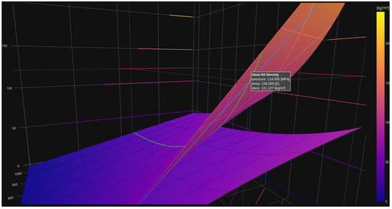 A custom tool was developed to analyze the real gas factor and density across a specified range of pressure and temperature. This is particularly useful when incorporating fuel mass into simulation models, such as finite element (FE) models [117,118,119]. The tool features an interactive three-dimensional (3D) visualization, allowing for a detailed examination of temperature–pressure interactions and their impact on hydrogen density. A depiction of the tool in its eye-friendly dark mode, intended to reduce visual strain and fatigue [120,121], is shown in Figure 5. The interactive version is freely accessible via GitHub (https://jav-ed.github.io/H2_Plot/, accessed on 10 March 2025). Additionally, the source code is available on GitHub (https://github.com/jav-ed/H2_Plot, accessed on 10 March 2025), allowing users to customize parameters such as pressure and temperature resolution.
