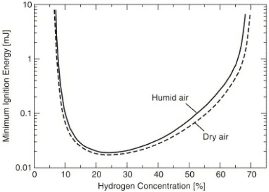 Minimum ignition energy (mJ) of hydrogen in humid air (90% relative humidity) and dry air (0% relative humidity) [151,156,157].