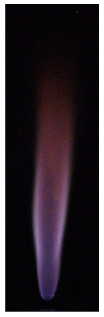Hydrogen flame at a laminar jet velocity of and a Reynolds number of 837. The image was captured using the Sony DSC D700 with an f/2.4 aperture and no filter [164].