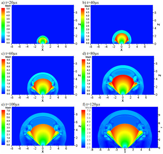Xu et al. [185] simulated these shock wave effects by compressing hydrogen to in a pressure vessel and releasing it into the free atmosphere through a nozzle. The simulation output, shown in Figure 9, depicts the system at various time intervals after the hydrogen exits the nozzle. To analyze this output, the Mach number () is defined using Equation (4) below, where a and v represent the speed of sound and local velocity, respectively. The Mach number expresses the ratio of local velocity to the speed of sound. For example, indicates that the local velocity is five times the speed of sound.