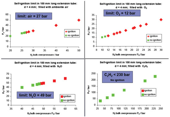 - Jallais, S.; Vyazmina, E.; Kuznetsov, M.; Grüne, J.; Xu, B.P.; Wen, J.X. Effects of Oxidants on Hydrogen Spontaneous Ignition: Experiments and Modelling. In Proceedings of the International Conference on Hydrogen Safety, Hamburg, Germany, 11–13 September 2017. [Google Scholar]