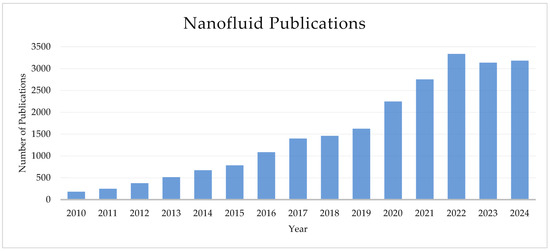 Number of research articles with the keyword or title of “Nanofluid” by MDPI, Elsevier, Taylor & Francis, Wiley, and Nature from 2010 to 2024.