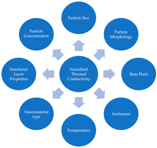 According to the enhancement of the thermophysical properties of the fluids using nanoparticles, one of the most promising areas of research in the field of nanoparticles is their use to enhance the thermal conductivity of fluids. Thermal conductivity measures a material’s ability to conduct heat. These nanoparticles are suspended in a fluid; they create a large surface area that can interact with the fluid molecules. This interaction results in an enhancement of the thermal conductivity of the fluid. The enhancement in thermal conductivity can be several times higher than the base fluid alone. This characteristic of nanofluids makes them suitable for use in a wide range of applications, as mentioned in the introduction. It has been reported that different factors affect the thermal conductivity of nanofluids, as shown in Figure 3 [19,20]. The importance and the effect of the factors given in Figure 3 are discussed in detail in the next chapters. However, the effect of temperature and particle concentration on thermal conductivity is inevitable, according to most of the research articles referred to in the review paper. The effect of the other parameters needs to be discussed in depth due to their complex relation with thermal conductivity.