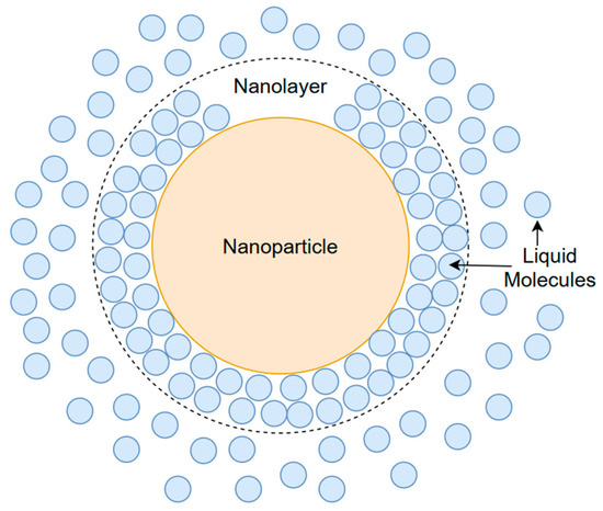 The formation of an interfacial layer around the nanoparticles that are dispersed in a fluid has been investigated. In Figure 4, it can be seen that liquid molecules’ formation around the nanoparticle creates an interfacial layer. This interfacial layer can be identified as one of the significant mechanisms to increase the thermal conductivity of nanofluids. This layer around the particles exhibits a higher thermal conductivity than the base fluid, and it acts as a thermal bridge between the nanoparticles and the base fluid, according to the theoretical developments of Yu and Choi [24].
