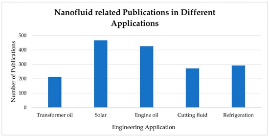 Figure 1 shows the number of research articles with ‘‘nanofluids” in their title according to the data from several esteemed publishers, such as MDPI, Elsevier, Taylor & Francis, Wiley, and Nature, and shows the recent development of nanofluid research in different fields. According to previous investigations, nanofluids have enhanced thermophysical properties, such as thermal conductivity, kinematic viscosity, thermal diffusivity, density, specific heat capacity, and even flash point [3,4]. The great potential of nanofluid applications has been demonstrated in many fields, such as biotechnology [5], renewable energy [6], high-voltage engineering [7], mechanical engineering [8], HVAC [9], automobile engineering [10], and even medicine [11].