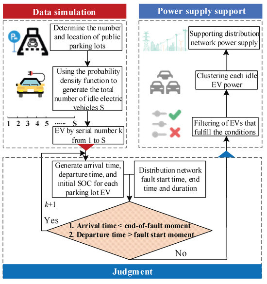 The public idle resources considered in this study are mainly EVs in public parking lots. Under extreme scenarios, EVs that remain parked for extended periods can participate in power restoration for the distribution network through tariff compensation incentives. The overall power supply support process is illustrated in Figure 1.