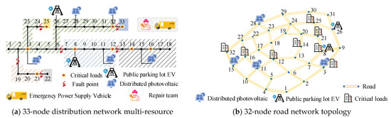 Currently, researchers have carried out relevant work for the collaborative participation of emergency resources in emergency power support. Research [8] presents a scheduling model for emergency power supply vehicles (EPSVs) and proposes a microgrid dynamic reconfiguration strategy. This strategy incorporates EPSVs to provide emergency power support and ensure power supply for critical loads in the distribution network. Other research [9] proposes a cooperative repair scheduling strategy between the distribution network and broken roads, which incorporates the repair of key roads by the broken road repair team into the route scheduling model of the faulty line repair team to improve the power supply reliability of the distribution system. However, scheduling time is not considered in the above resource synergistic model, which will be affected by the actual traffic flow, and the power supply restoration effect is not realistic. Therefore, the scheduling of mobile emergency resources needs to consider the road resistance model to reflect the traffic factors in the actual scheduling situation. In addition, various emergency resources involved in active power supply support differ in multiple aspects. For example, stationary resources, such as distributed photovoltaics [10], wind turbines [11], and energy storage systems [12], participate in power supply restoration through local access to the distribution network [13,14]. However, their power supply is limited in scope and flexibility. In contrast, mobile resources, such as EPSVs [15,16,17] and EVs, can be spatially transferred through urban roads, enabling cross-regional power restoration. In terms of output characteristics, PV output is larger during the day, and public parking lots have more idle EVs participating in the output at night. In resource scheduling costs, existing synergistic strategy considerations are incomplete, and emergency resources are usually individually or sequentially involved in power supply support. Thus, synergistic cooperation between the emergency resources of urban distribution networks needs to consider output characteristics, power supply flexibility, and scheduling economies, in order to fully fulfil the emergency power supply demand of the distribution network.