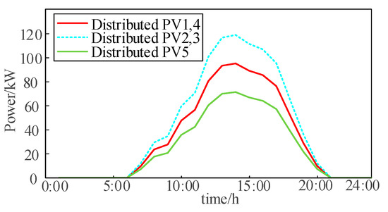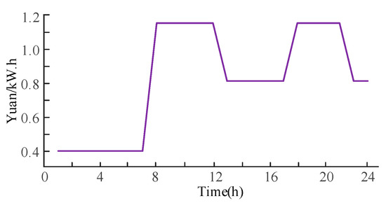 In this study, a modified IEEE 33-node power distribution system and a 32-node transportation network model are used as case studies for detailed analysis. The architecture of the distribution and road networks is illustrated in Figure 2. Five groups of photovoltaic systems are deployed in the system, and their predicted power profiles are shown in Figure 3. For load valuation, the interruption cost factor is set at 15 Yuan/kWh for critical loads and 5 Yuan/kWh for ordinary loads. To ensure that the distribution system voltage operates within the safety threshold, the voltage fluctuation range is maintained between 0.9 and 1.10 per unit (p.u.). Additionally, this study references the time-of-day tariff implemented in a specific region for economic dispatch and optimization analysis, as shown in Figure 4. The power supply restoration period for the distribution network is set from 9:00 to 15:00, totaling 7 h. The roadway impedance parameters in this study are α = 0.15, β = 4. The mean values for the total number of EVs and the initial state of charge in public parking lots are 100 and 50, respectively, with standard deviations of 25 and 15. The parameters related to emergency resources are provided in Table 2.