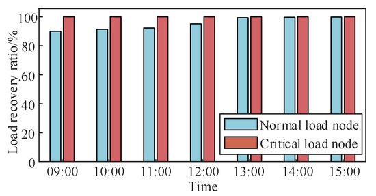 After the collaborative powering of multiple resources as in the case of this study, the critical loads of the distribution network are able to maintain a high percentage of load recovery from the very beginning of the fault. For the recovery rate of ordinary loads, this study’s case gradually rises with the running time, and always stays above 90%, and finally reaches 100% recovery at 15:00.