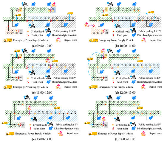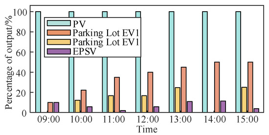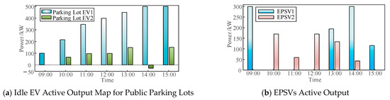 For the multi-resource emergency coordination case proposed in this study, the resources’ output is specifically analyzed. The dispatching outpouring of each resource is shown in Figure 8. The EVs in the two groups of public parking lots are discharged on-site to support the restoration of power supply to the distribution network during the power restoration period, their outputs are shown in Figure 8a, and the power discharged by the EVs to the distribution network is positive. According to Figure 8b, during 10:00–12:00 when the power supply is restored, the emergency power vehicles have less output, the load demand deficit of the distribution network is mainly supplemented by the EVs in the public parking lot, and the PVs are fully discharged at this time. From 8a, it can be seen that the EV output of public parking lot 2 has a small negative value at 14:00, which is due to the fact that the total output of emergency power vehicles and EVs at that moment is larger than the load demand of the distribution network, resulting in the excess power being absorbed by EV charging. Eventually, the power supply can be complementary between the emergency resources, thus meeting the load demand of the users.