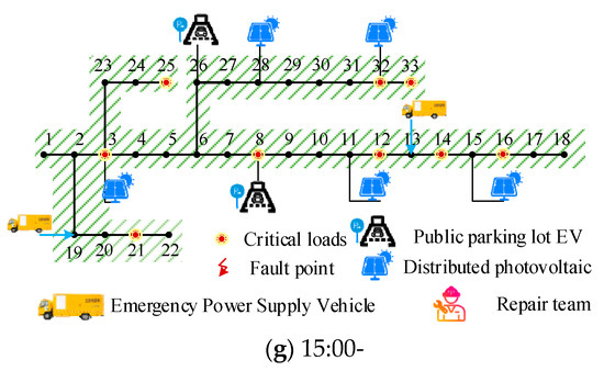 Case 4: Considering the power supply priority of emergency resources, the distribution network undergoes collaborative power restoration using local distributed PVs, EPSVs, and public parking lot EVs. Simultaneously, line repair teams are dispatched to restore the faulty lines.