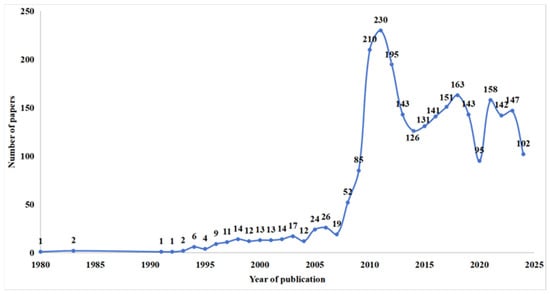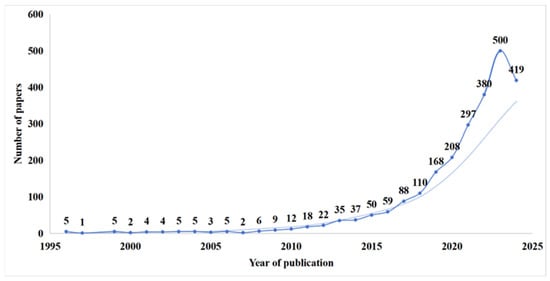 In the WOS, literature in the research field of this paper first appeared in 1996, and the annual publication number was below 10 from 1996 to 2009. In 2010–2018, the annual number of publications increased year by year, with 110 in 2018. Since 2019, the number has increased sharply, reaching 500 in 2023, and in 2024 (January to August), the number was 419.