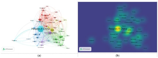 In Figure 7a, the size of the nodes represents the number of publications from each country, with larger nodes indicating a higher volume of publications. According to VOSviewer, 61 countries and regions have published more than five papers, divided into six clusters, indicating collaborative relationships among them. Figure 7b illustrates the cooperation density among countries, showing that countries such as China, the United States, and the United Kingdom display high densities, which indicates a substantial number of publications.