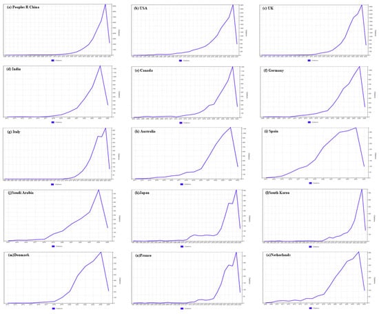 According to the data provided in Table 3, China accounts for 44.7% of the global literature volume (h-index = 84), but the average citation frequency per paper (29.08) is lower than that of the USA (41.45), the United Kingdom (47.49), Canada (46.92), and Germany (46.89). This indicates that although China has a substantial volume of research output in this field, the citation frequency of these publications is relatively low, reflecting insufficient recognition and influence in the international academic community. The citation curve of the literature from various countries is illustrated in Figure 9. Among the top 50 highly cited studies in China, technical literature constitutes the majority (about 70%), while there are relatively few studies on basic theoretical research, policy research, typical case analysis, and international perspectives, which may also lead to its low citation frequency. In addition, although China has garnered significant achievements in terms of publication volume, its centrality score is only 0.03, far lower than that of countries such as the USA (centrality = 0.24), the UK (centrality = 0.25), Canada (centrality = 0.34), Spain (centrality = 0.22), France (centrality = 0.64), etc. These data reflect that China’s influence and international cooperation in the field of green transportation in regards to electric vehicle cities need to be improved, and efforts are still needed to improve research quality and enhance international cooperation and influence. This is not only a motivation for Chinese researchers, but also an inspiration for future development directions.