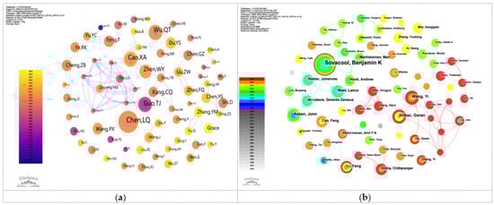 The author co-occurrence analysis can identify the core authors in a certain field and the cooperation intensity between authors. The number of publications is presented in the form of the size of nodes, the thickness of connecting lines shows the cooperation intensity between authors, and the order of publication time is presented in the form of color shades. The author cooperation views of the CNKI literature and the WOS literature are shown in Figure 10.