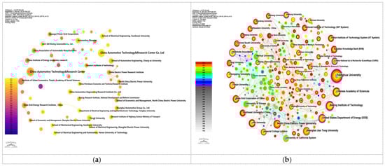 Through the research institution cooperation view of the literature in the WOS, it can be seen that Tsinghua University, the Chinese Academy of Sciences, the Beijing Institute of Technology, the United States Department of Energy (DOE), Shanghai Jiao Tong University, North China Electric Power University, the University of California System, Imperial College London, Southeast University—China, and the University of Sussex are the top 10 research institutions with the largest number of publications. Among them, there are six Chinese research institutions, two American research institutions, and two British research institutions, as shown in Table 7.