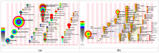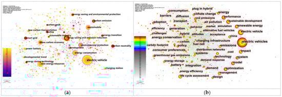 From the data above, it can be seen that the number of publications in the research field of this paper increased rapidly around 2010, both in the CNKI and WOS, indicating that “electric vehicle” has increasingly become the hot spot for building green, low-carbon cities and developing green, low-carbon transportation. Therefore, this paper chooses 2010 as the starting time, focusing on analyzing literature from 2010 to 2024. This choice is based on the considerations that since 2010, the Chinese government has significantly increased its support for the electric vehicle industry and introduced a series of encouraging policies [40]. Notably, the “Ten Cities, Thousands of Vehicles” program (launched in 2009) entered its large-scale promotion phase in 2010. These initiatives marked the government’s systematic strategic layout, injecting strong momentum into the research and application of electric vehicles [41]. Additionally, from the perspective of data availability and completeness, literature published after 2010 is more abundant and comprehensive in the relevant databases, enabling a more accurate reflection of research trends and developments in this field.