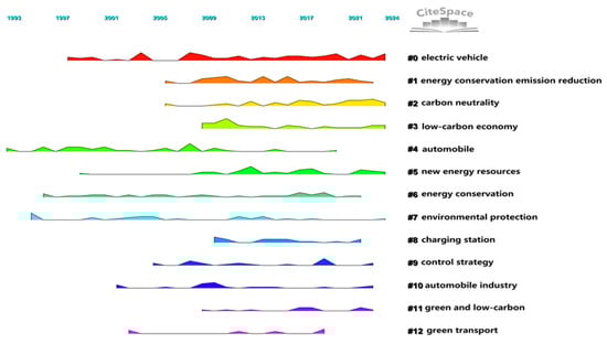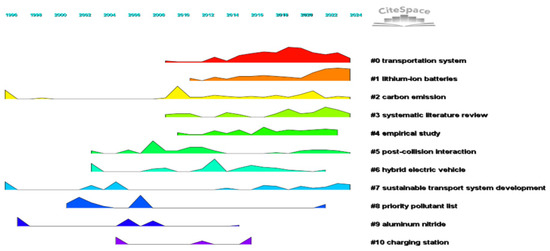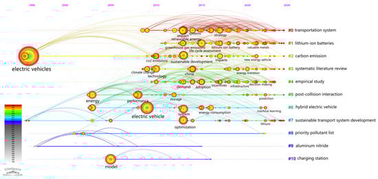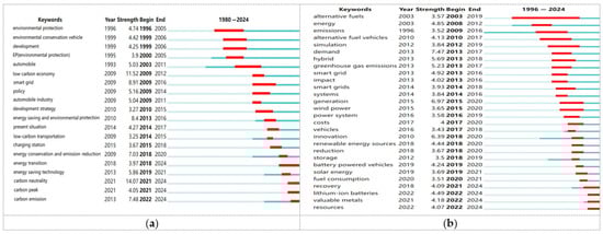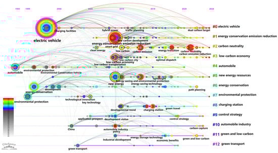 After completing the “Remove Duplicates” step in CiteSpace, statistical analysis of the number of annual publications in the CNKI literature was conducted. In the CNKI, the keyword “electric vehicle” first appeared in 1980. The number of annual publications was less than 10 from 1980 to 1996, and increased year by year in 1997–2007, with approximately 20 examples appearing in 2007. From 2008 to 2011, the number of annual publications in the field of electric vehicle in China increased rapidly from 19 to 230, while in 2012–2014, the number decreased year by year, with only 126 in 2014. Then, from 2015 to 2018, the annual number of publications again increased year by year, with 163 in 2018. Currently, from 2019 to 2024, the number appears to be in a fluctuating state, in which it decreased to 95 in 2020, increased to 102 in 2024 (January to August), and then the annual number of publications in 2019, 2021, 2022, and 2023 stabilized at about 150.