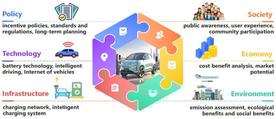 With the rapid advancement of urbanization in China, urban traffic pollution has become more and more serious, which has been one of the major obstacles restricting the sustainable development of cities. Particularly in the field of transportation, especially urban transportation, the realization of the “twin goals” (carbon peaking and carbon neutralization) is facing severe challenges. Vehicle exhaust is one of the main sources of urban carbon emissions. According to relevant data, carbon dioxide emissions from the transportation industry account for about 10% of the total carbon emissions in the country [13]. Therefore, reducing the use of traditionally fueled vehicles is the key to reducing carbon emissions [14]. As a zero-emission transportation mode [15], electric vehicles provide many benefits, such as energy conservation, energy storage, and emission reduction. Promoting electric vehicles is an effective way to simultaneously ensure energy security and achieve the “twin goals” [16]. In view of this, the promotion of electric vehicles, the construction of low-carbon cities, and the realization of green transportation have become urgent issues.