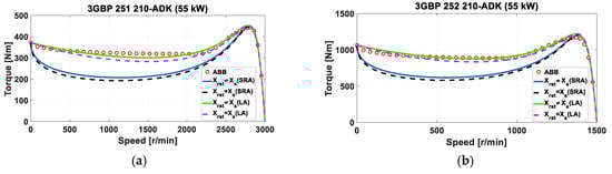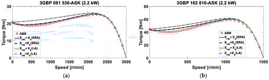 This indicates that for motors with power ratings of 2.2 kW and 5.5 kW, the torque-speed characteristics obtained using the SRA align more closely with the reference torque-speed characteristics. Additionally, the second approach provides a slight improvement in the obtained torque-speed characteristics compared to the first approach. For motors with power ratings of 55 kW and 90 kW, the torque-speed characteristics derived from the LA show better alignment with the reference torque-speed characteristics. Similarly, the second approach achieves an improvement in the torque-speed characteristics compared to the first approach.
