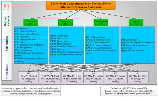 - Kassem, A.; Al-Haddad, K.; Komljenovic, D.; Schiffauerova, A. A value tree for identification of evaluation criteria for solar thermal power technologies in developing countries. Sustain. Energy Technol. Assess. 2016, 16, 18–32. [Google Scholar] [CrossRef]