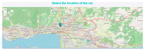 An interface has been designed that can be used as a simulation for the GRU model to estimate time. An example of this interface is shown as a tool on the application. The interface will ask the user to enter some data and generate predictions using the data provided. First, as shown in Figure 11, the driver’s location is requested to be marked on the map. In addition, the vehicle’s battery capacity, current occupancy rate, and the same information are requested separately for the vehicle or vehicles waiting in the queue.