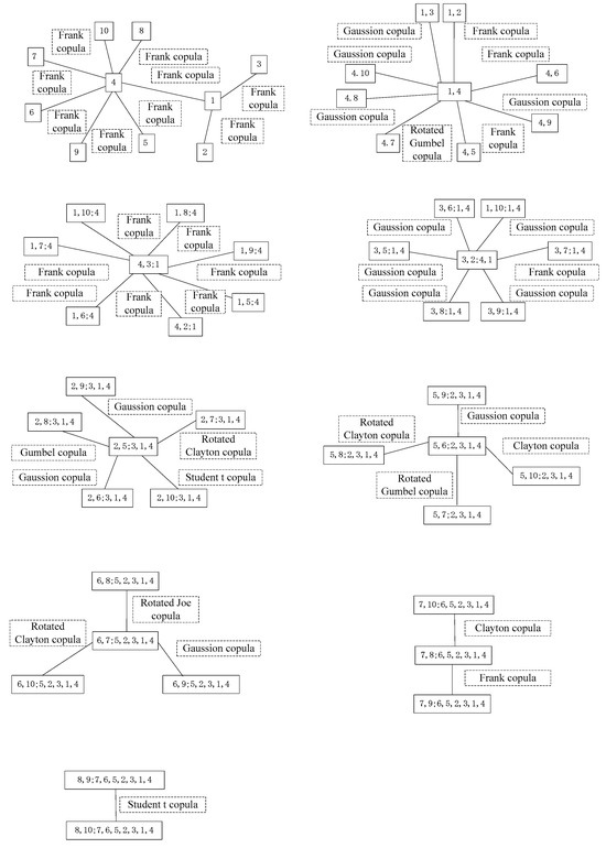 - The first layer pair-copula sequence was constructed by bivariate copula functions of one random variable with other random variables: