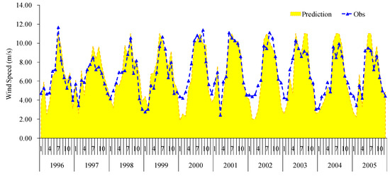 Historical wind speed and results of the validation horizon in 1996–2005.