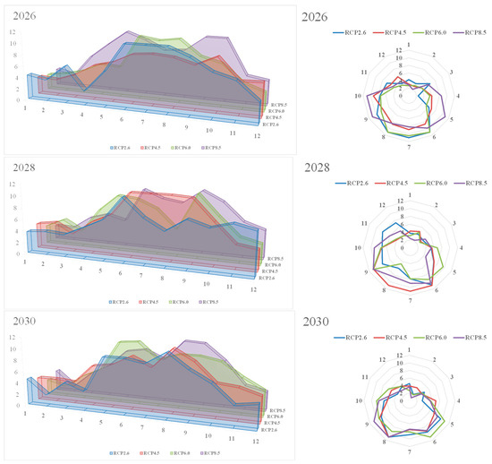 The downscaling results of the forecasting horizon were calculated using the trained 10-dimensional multivariate copula using data from the nine GCMs. Table 6 shows the results of the forecasting horizon in 2016, 2020, and 2030. Figure 6 presents the results of the forecasting horizon for 2016–2030. High radiative forcing will make wind speed more extreme in the forecasting horizon. High winds will occur from June to September, indicating that high-wind weather will be more frequent and sustainable in the future. The rich wind resources show that Urumqi has a high potential for wind power development. Low wind speeds will occur from December to March 2030; however, the average low wind speeds in the future will be lower than that of the historical average. These results indicate that the wind speed will be more extreme in each scenario. Sustained high winds in the future mean high-quality wind resources and will lead to the increased potential for wind power generation.