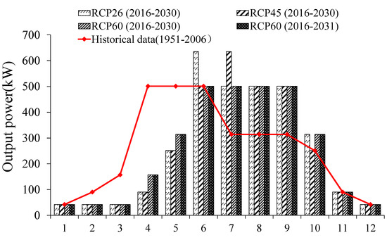Our results also show that the wind speed will change with an increase in radiative forcing. The wind power will have great potential in Urumqi. Meanwhile, the instability of wind power can impact wind power in Urumqi. Figure 7 shows the output power of one wind turbine generator monthly, which is calculated based on the output power function and average values of wind speed in Figure 5. Figure 7 shows that the output power will be stable and a high output will be maintained from June to September. This shows that high-quality wind energy can be obtained in these four months. In contrast, four months will be low output power months (December to March), indicating that the wind power curtailing rate will rise from December to March.