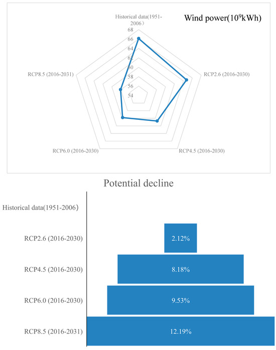 The installed capacity of wind power in Urumqi until 2016 was 1.48 × 106 kW. The wind power over 15 years was obtained based on the output power function and downscaling results of the forecasting horizon (2016–2030). Figure 8 shows the result of wind power generation over 15 years in each RCP scenario and historical observation data, respectively. For instance, wind power generation of RCP2.6–8.5 was 64.71 × 109 kW h, 60.70 × 109 kW h, 59.81 × 109 kW h, and 58.05 × 109 kW h, indicating that Urumqi has considerable potential for wind power. The CO2 emission reduction potential of RCP2.6–8.5 was 54.23 × 106, 50.87 × 106, 50.12 × 106, and 48.65 × 106 tonnes. However, wind power will reduce with an increase in the radiative forcing. This indicates that the instability of wind based on an increase in radiative forcing will lead to wind power generation being curtailed and low wind power generation. For instance, wind power generation from RCP2.6 to 8.5 will reduce by 2.12%, 8.18%, 9.53%, and 12.19%, respectively.
