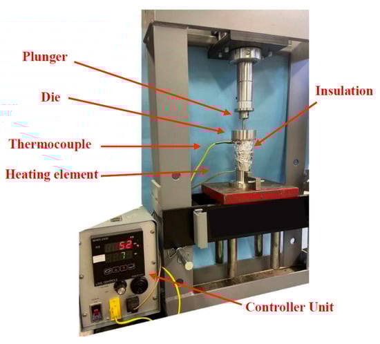 The pelletization procedure of biomass was done according to Yu et al., 2021 [35]. To understand the effect of the physiochemical properties of the biomasses on pelletization, all process control parameters, including die size, pressure, die temperature, and retention time, were set constantly to their optimum value based on the literature review. The moisture content of samples was adjusted to 12% (±0.5) by spraying water on the samples. Following the moisture adjustment, a lab mixer was used to condition the biomass for 60 min, ensuring homogeneous moisture distribution. A cylinder die unit with a 6.35 mm internal diameter and 90 mm length was filled with the ground sample. The die was heated to 120 °C using a heating element controlled by a temperature controller. The material was compressed using a plunger with a diameter slightly less than the diameter of the die (Figure 1). The maximum applied pressure was 10 kN. After 5 min of retention time, the pellet was pushed out of the die. Approximately 0.6–0.7 g of biomass was used for each pellet. Ten pellets were made from each sample and, after cooling down, were stored in sealed glass bottles for further analysis.