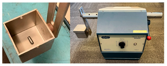 The pellet durability (PDu) was measured by using a single-pellet durability analyzer designed and built in-house [36]. The device consisted of a small, square box, 60 × 60 × 60 mm, with a removable lid (Figure 2). The box was attached to the arm of a laboratory shaker (Burrell Scientific Wrist Action—Model 75 Shaker, Burrell Scientific, Zelienople, PA, USA). The process involves weighing a pellet, placing the single pellet along with a metal pellet of 6 mm diameter and 12 mm length in the cavity, covering the box with its lid, securing the top, and shaking the box for 10 min. Upon completion of the shaking, all its contents are sieved through a 3.15 mm screen to separate the broken particles that were generated during the shaking process. The single-pellet durability is calculated by Equation (3).