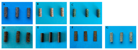 Pelletized biomasses from crops foliage using the manual pellet press: (A) corn, (B) soybean, (C) tomato, (D) eggplant, (E) cucumber, (F) summer squash, and (G) sawdust.