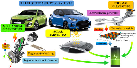 - Mechanical harvesting: various harvesting methodologies that exploit vehicle vibrations to recover electrical energy are presented, placing particular attention on regenerative suspensions and piezoelectric harvesting and presenting innovative solutions with excellent performance (Section 2).