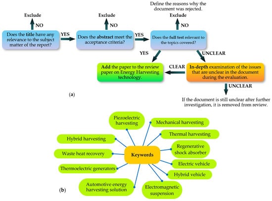 This section describes the selection criteria for scientific articles, emphasizing important factors such as publication year, redundancy with other studies, and relevance to the topics covered. This review aims to give readers a thorough, up-to-date understanding of energy harvesting applications. The PRISMA methodology is used in the paper selection process, guaranteeing the validity and relevance of the selected strategy [,]. The first step in the selection process is analyzing each prospective article’s title to find relevant keywords. The abstract is then examined to determine how well it fits the topics covered in this study. The article is carefully read and examined if it seems pertinent. For articles with uncertainty issues, ambiguities are resolved by consulting additional sources. The article will be deleted if further research reveals that the information is unclear.