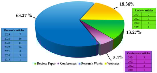 The selection procedure, which includes evaluating the title’s relevance, the abstract’s affinity, and the scientific worth of the manuscript, is depicted in Figure 2a. The primary terms used to filter the literature are shown in Figure 2b. For all the topics covered, the same methodology has been used. The authors examined 114 documents, including research and review articles, conference papers, and websites, to accurately analyze the subjects discussed in this manuscript (Figure 3).