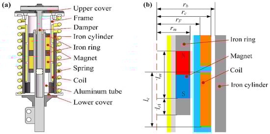 Jiang et al. studied a dual-mode magnetic suspension with high safety and a compact structure to analyze its energy-harvesting performance []. The work examined how the actuator’s structural parameters affect energy regeneration, using the finite element method to evaluate factors such as the magnetic ring, cap thickness, heat dissipation, and air gap. The electromagnetic actuator consists of a fixed part on which the permanent magnets are positioned and a moving part consisting of the winding (Figure 6).