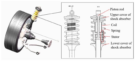 Of considerable interest are hydraulic systems, which use a fluid moved by the suspensions’ oscillations that expand inside hydraulic motors directly connected to electric generators ([,]). In addition to the recovery of electrical energy, these systems can improve driving comfort on irregular roads; the system proposed in [] is even able to recover energy through the pitch and roll oscillations of the vehicle, making it more stable. Systems using the electromagnetic principle are much more compact and simple (Zhou et al. [], Jiang et al. [], Hu et al. []). Such systems can be installed directly in the spring–damper system of the vehicle’s suspension, making it easy for the operator to access during maintenance. This technology certainly has several advantages, including simplicity of construction and ease of installation, and it does not require systems that convert motion since its operation adapts optimally to the linear movement of the suspension.