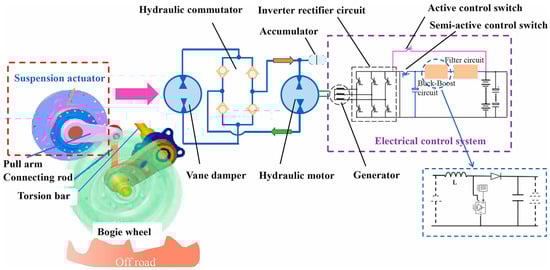 The authors proposed a system for improving vehicle dynamics and recovering energy by combining the advantages of an EHSA and linked hydraulic suspension. The main parts include a hydraulic motor generator unit, four hydraulic cylinders, four hydraulic rectifiers, and a high- and low-pressure accumulator. Experimental results showed that the HIIRS significantly improved vehicle stability: the roll angle was reduced by 34.42% in a lane change maneuver and the pitch angle by 28.91% in straight-line braking, with an initial pressure of 40 bar and a load resistance of 10 Ohm. Furthermore, the system generated 87.69 W and 147.86 W of regenerative power in the two scenarios, respectively, highlighting the potential of the HIIRS to improve vehicle safety and energy efficiency. With the same approach, Zhang et al. in [] developed a novel mechanical–electric–hydraulic regenerative suspension system (MEH-RSS) designed for high-speed tracked vehicles capable of kilowatt-level energy recovery under off-road conditions. This technology relies on a hydraulic motor generator (HMG) to efficiently convert hydraulic energy into electricity, even in limited spaces. The system proposed by the authors is shown in Figure 7. It consists of a vane damper, a hydraulic switch, and an HMG. When the tracked vehicle drives on rough roads, a connecting rod transmits the vibration to the hydraulic damper, allowing the oil inside to circulate, which expands into a unidirectional hydraulic motor that turns an electric generator. The operating environment of high-speed tracked vehicles is complex and variable. A typical stochastic road solicitation is employed to examine the energy recovery characteristics of the MEH-RSS under various road conditions and driving speeds. In developing the random road excitation model, the power spectral density (PSD) characterizes the statistical properties of road surface roughness, while Gaussian white noise synthesis generates the corresponding time-domain excitation signal. The power generated is converted from unstable alternating current to stable direct current to charge the battery pack. Tests have shown that the energy recovery module is highly efficient, achieving hydraulic–electric conversion with a maximum efficiency of 40.4%, an external resistance of 5 Ω, and an electrical power of 1104 W.