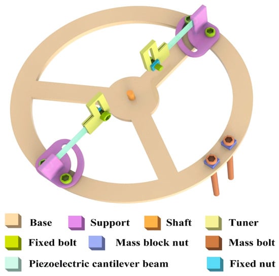 Yu et al. propose a rotating piezoelectric energy harvester (PEH) to harness automotive motion and convert vibrations into electrical energy []. Their system consists of a circular base and two piezoelectric cantilever beams. Two opposed supports are placed on the base to hold two piezoelectric beams. Figure 9 illustrates the piezoelectric harvesting device proposed by the authors. The supports can be rotated to vary the angle between the piezoelectric beam and the diameter. A synchronizer is placed on the free end of the piezoelectric cantilever to act as the tip mass of the beam. To validate the system, the authors conducted an experiment using a stepper motor with a pulse frequency of 1700 Hz, a point mass of 5.6 g, a counterweight mass of 31.6 g, and a load resistance of 1 kΩ, obtaining a maximum output power of 6.25 mW.