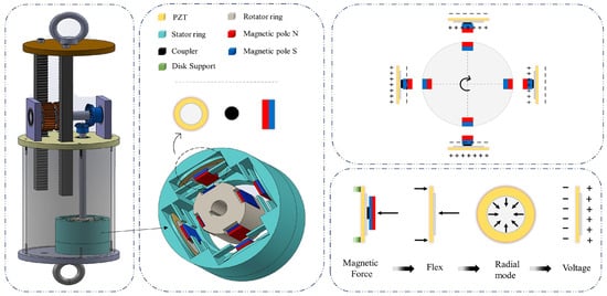 In recent years, the scientific community has paid considerable attention to electromechanical harvesting [] because it offers the possibility of collecting energy from mechanical sources to power devices onboard the vehicle and, simultaneously, to power the battery. In this context, the main characteristics of piezoelectric devices are their power density, compact size, and ease of use []. In this regard, Zhang et al. developed a novel no-contact magnetic force-based piezoelectric EHSA designed to exploit the suspension vibrations of vehicles, especially light trucks []. The system, mounted in parallel to the rear suspension system, converts vibrations into rotation via a ball screw, with a unidirectional high-speed rotor supported by a bearing and a planetary gear mechanism. The EHSA system, highlighted in Figure 8, consists of a rotor with alternating polarity, permanent magnets, and a stator with piezoelectric laminations, on the center of which magnets are positioned. Through magnetic attraction and repulsion, the piezoelectric unit undertakes frequent deformations, generating electricity. In tests, the EHSA achieved a maximum power of 7.51 W and an average power of 1.89 W with sinusoidal excitation (40 mm, 0.4 Hz). Under random vibrations, the device powered 824 LED lights and a temperature and humidity sensor, demonstrating the ability to power self-powered appliances onboard.
