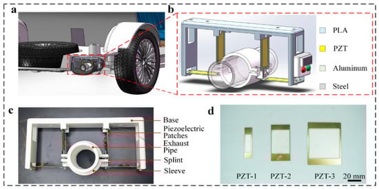 The piezoelectric harvesting system proposed in [] consists of 4 piezoelectric beams mounted on a fixed frame that deform to the vibrations of the exhaust pipe. (a) assembly configuration, (b) system design, (c) prototype, (d) 3 sizes of piezoelectric plates.