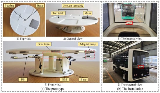 Tang et al. developed an innovative kinetic energy harvesting (KEH) system for driverless electric buses to recover the inertial kinetic energy usually wasted during driving []. The proposed technological solution is based on an irregular turntable that collects and amplifies the energy generated by the omnidirectional accelerations of the vehicle, and the system is shown in Figure 12. The KEH system is composed of three main modules: the energy input module, which collects and amplifies vibrations via a gear train and a magnet array; the energy conversion module, which converts kinetic energy into electricity by combining an electromagnetic generator and a piezoelectric oscillator; and the energy management module, which stores the collected energy in capacitors to power low-power devices. Experimental tests showed that the KEH system can generate an average power of 8.31 mW at an acceleration of 8 m/s2. Furthermore, the hybrid system achieved a charging voltage of 3.72 V with a 220 μF capacitor, showing an improvement of 481% compared to the electromagnetic system alone and 11% compared to the piezo system alone; thus, the KEH system was able to power 54 LEDs, confirming its potential for self-powered applications.
