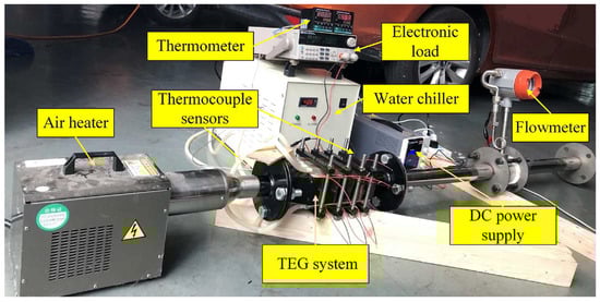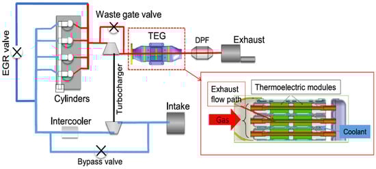 Thermal energy harvesting is mainly used in ICE-based or hybrid vehicles by exploiting the wasted heat from the combustion engine (about 70% of total energy) and converting it into electrical energy via thermoelectric generators (TEGs). More than half of this thermal energy loss is caused by waste heat from exhaust gases alone []. A TEG consisting of n- and p-type modules enclosed in a heat exchanger assembly is a bidirectional energy converter that converts heat into electrical energy using the Seebeck principle [].