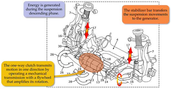 Other systems instead exploit the kinetic energy produced by the vehicle’s suspension to set in motion a flow that evolves in a hydraulic circuit. Zou et al. developed an innovative hydraulic interconnected integrated regenerative suspension (HIIRS) system, which can harvest energy from suspension vibrations and improve vehicle handling by decoupling the four vehicle vibration modes (bounce, roll, pitch, and deformation) [].
