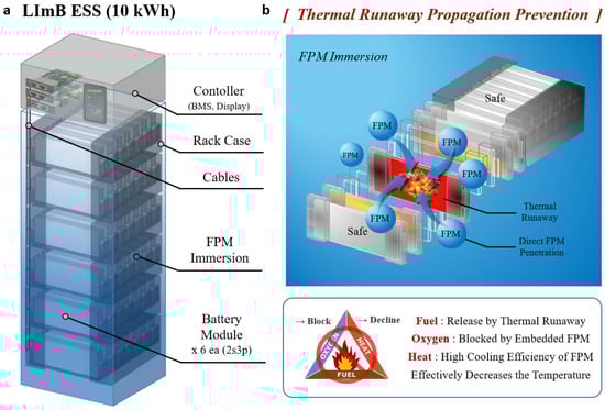 LImB ESS (10 kWh) and its effectiveness: (a) Construction and structure of the LImB ESS (10 kWh). (b) In the event of thermal runaway, the immediate internal penetration of the surrounding FPMs leads to oxygen isolation and temperature reduction, preventing fire propagation.