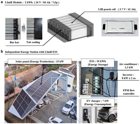 Detailed overview, structure, and specifications of LImB: (a) LImB module. (b) Independent energy station with solar panels, ESS, and EV charger.