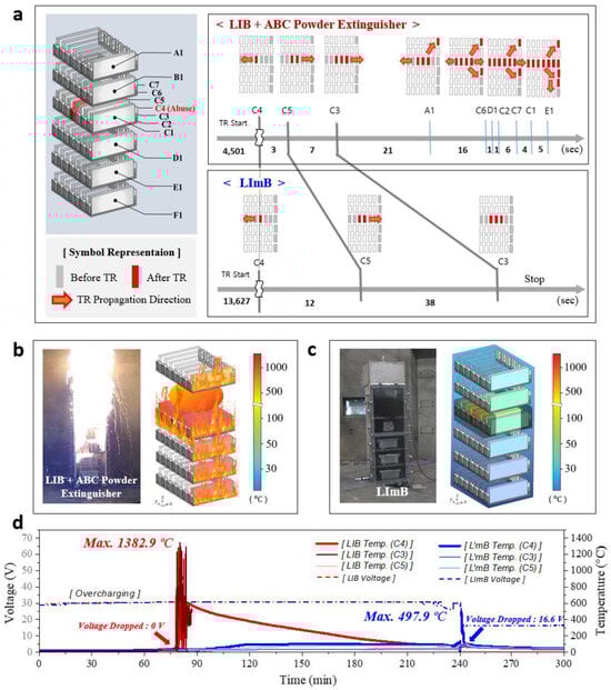 As shown in Figure 3b, the LIB ESS with automatic fire-extinguishing diffusers suffered immediate fire spread at the onset of thermal runaway with a large explosion and sparks. There was little effect of the automatic fire-extinguishing diffuser, and most of the batteries reached temperatures above 800 °C. However, as shown in Figure 3c, the onset of thermal runaway was delayed by the thermal management effect and the fire was immediately suppressed in the LImB ESS. Also, the duration and size of the fire were very small because of the penetration of the liquid agent. The LImB reduced thermal propagation by 75% compared to the LIB, achieving a peak temperature of 498 °C versus 1363 °C in the LIB, whereas the rest of the battery remained at room temperature. A video of the thermal runaway test is provided in the Supplementary Materials.